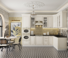 Рамочные филенчатые фасады из МДФ: Каждый фасад выполнен из высококачественного МДФ с рамочной конструкцией и филенками, что придает кухне характерный классический вид. Эти фасады не только красивы, но и устойчивы к механическим повреждениям и воздействию влаги.