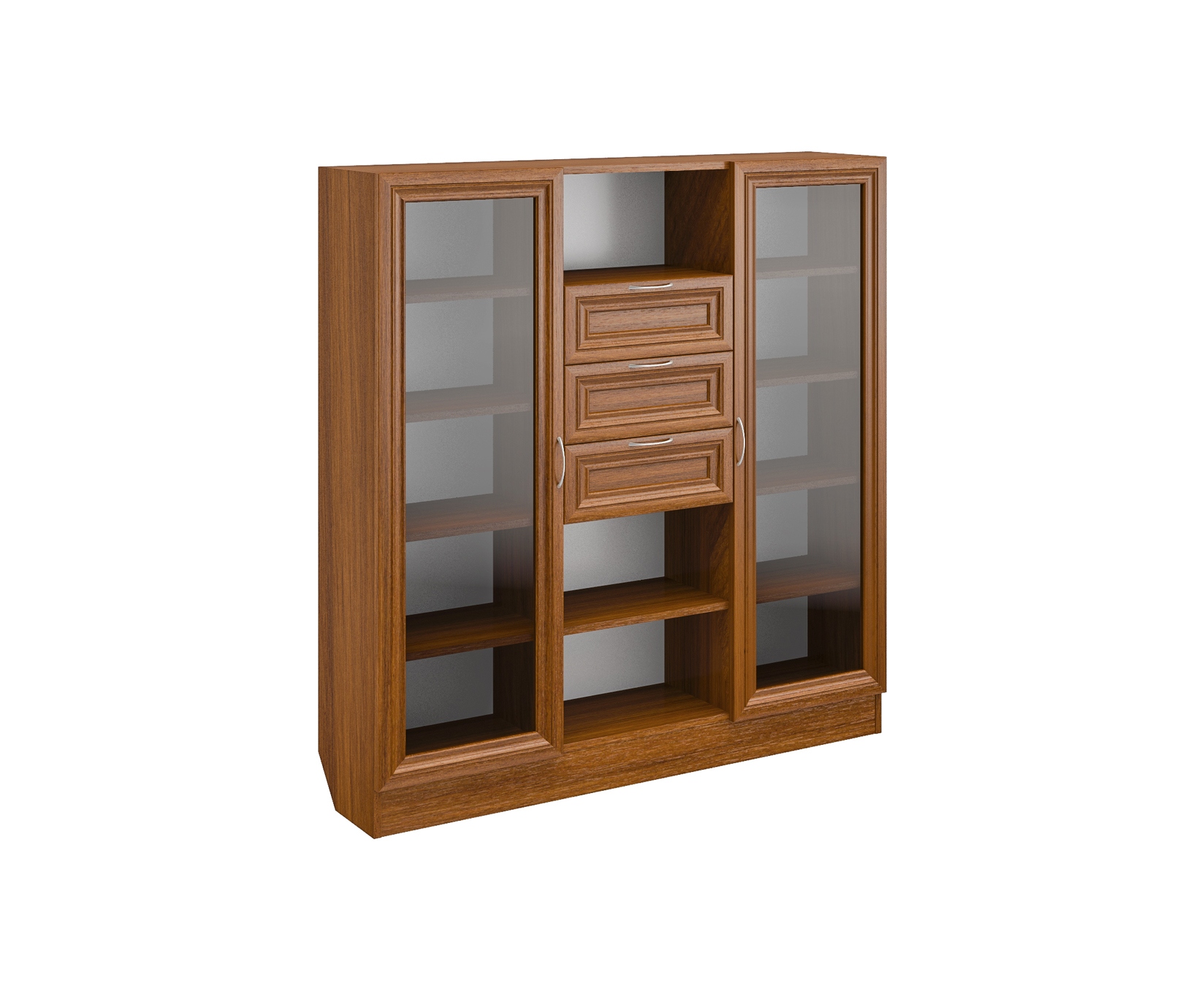 ШК-10 Изделие представляет собой универсальный высокий, книжный комод с застекленными секциями и выкатными ящиками. Корпус выполнен из Ламинированной ДСП высокого качества с насыщенным цветом. Наполнение комода представляет собой три вертикальных секции, средняя секция содержит три открытых ниши и три выкатных ящика. По бокам справа и слева расположены закрытые симметричные секции с распашными дверьми. В каждой такой секции по четыре полки. Фасады выполнены из материала МДФ.