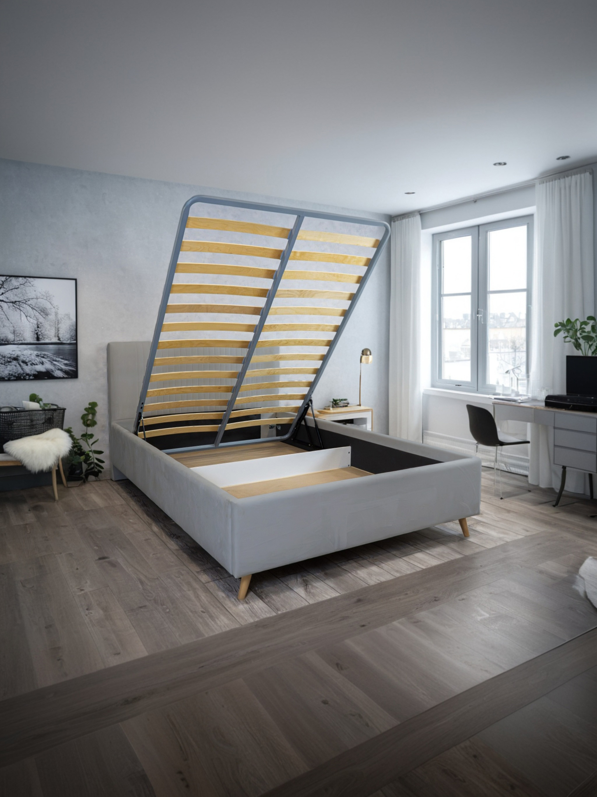 Добротная стильная кровать, есть ящик для белья и подъемный механизм. Ножки достаточно высокие, чтобы проехал робот-пылесос