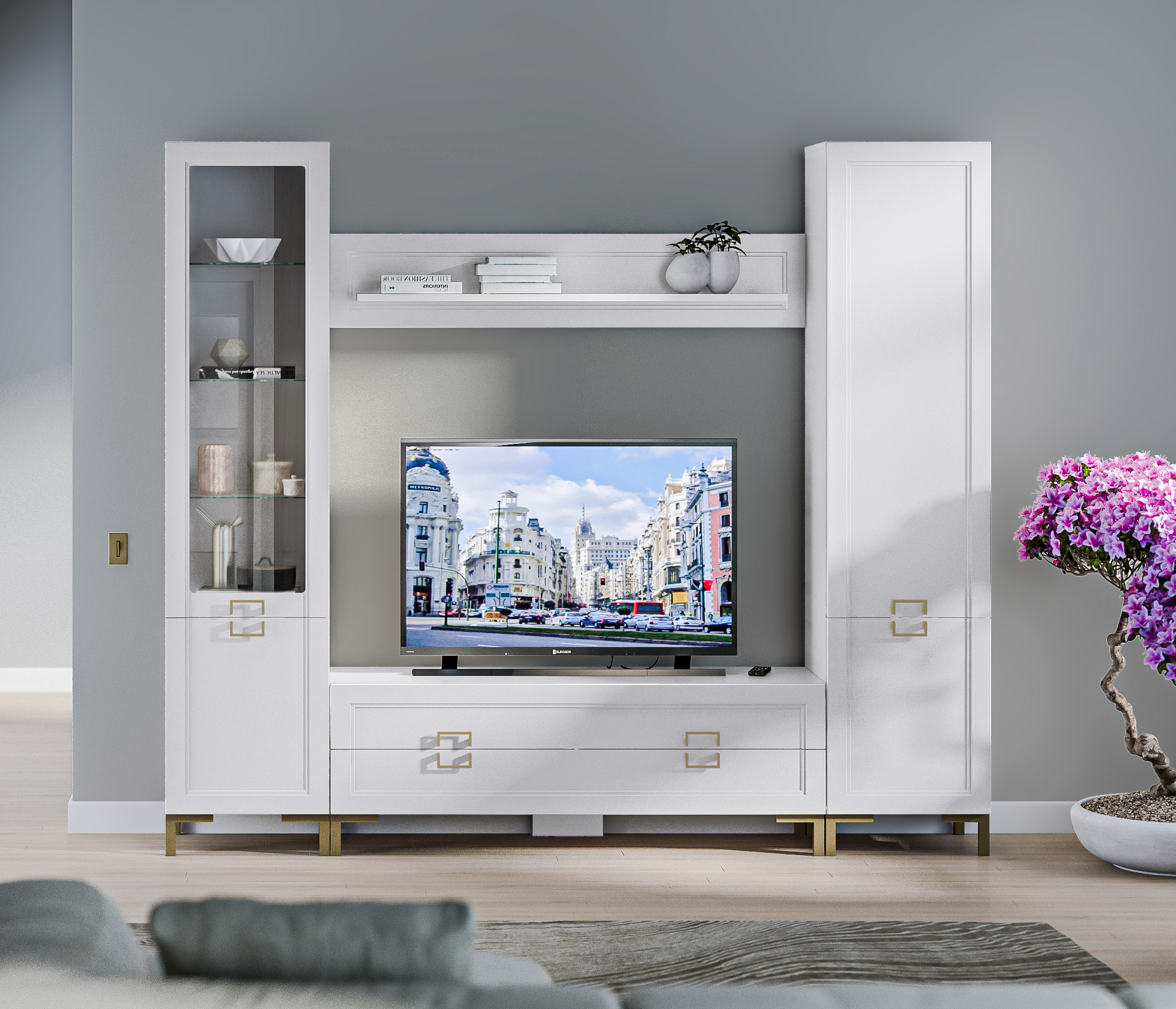 Модульная коллекция Ассоль в белом цвете — это стильное и функциональное решение для вашего интерьера. Корпус выполнен из качественного ЛДСП, а фасады из прочного МДФ, что обеспечивает долговечность и легкость в уходе. Элегантные золотые ручки добавляют изысканности и шарма. Модули коллекции можно комбинировать по вашему усмотрению, создавая уникальные и практичные решения для любого пространства, или выбрать из готовых комплектов.<br>Габаритные размеры гостиной: ширина 2500 мм, высота 2170 мм, глубина 410 мм