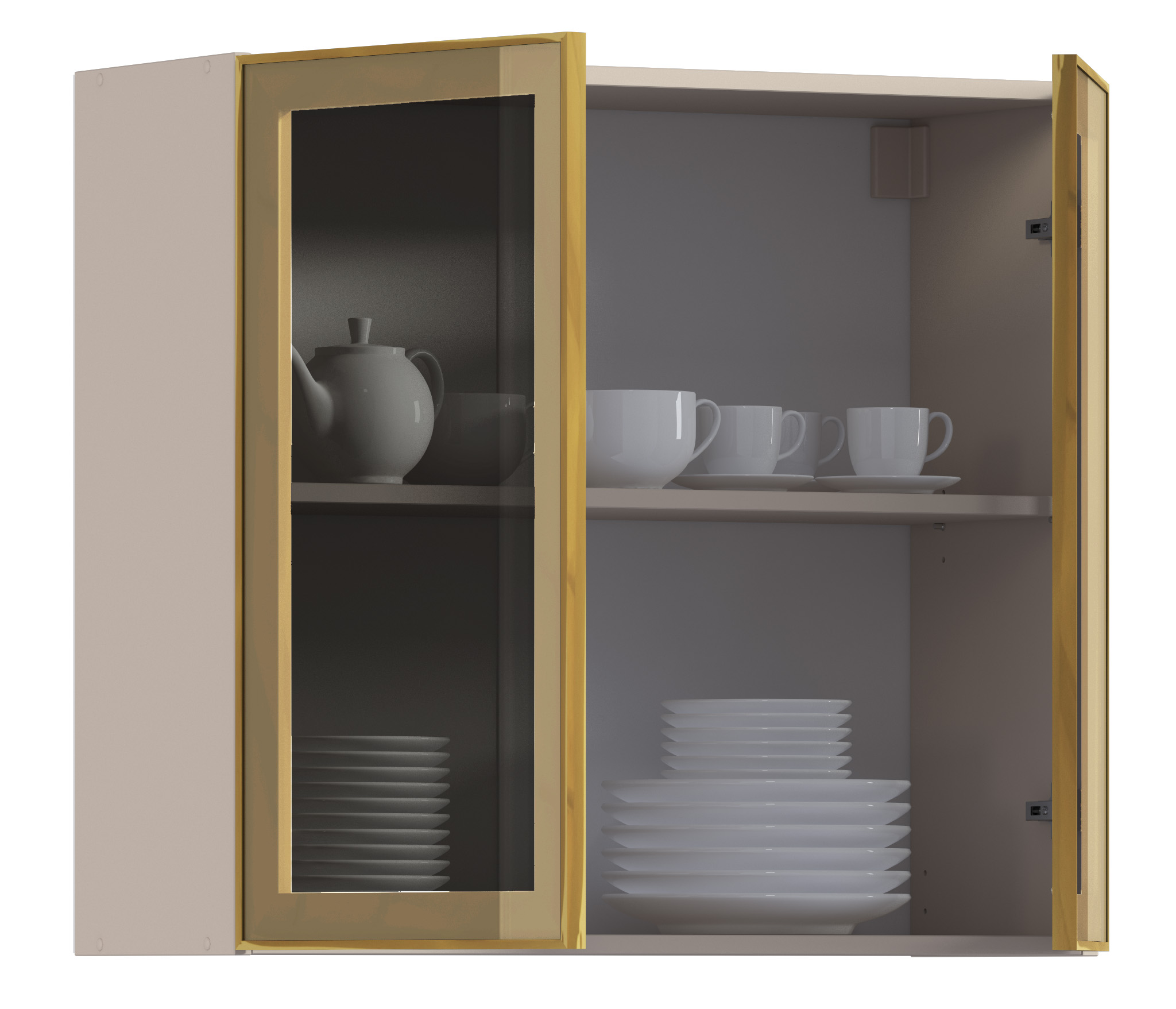 Комплект включает в себя корпус кухонной полки (песочного цвета) с необходимой фурнитурой, фасад из алюминиевой рамки золотого цвета и бронзового стекла, а также ручку, соответствующую цвету рамки фасада.