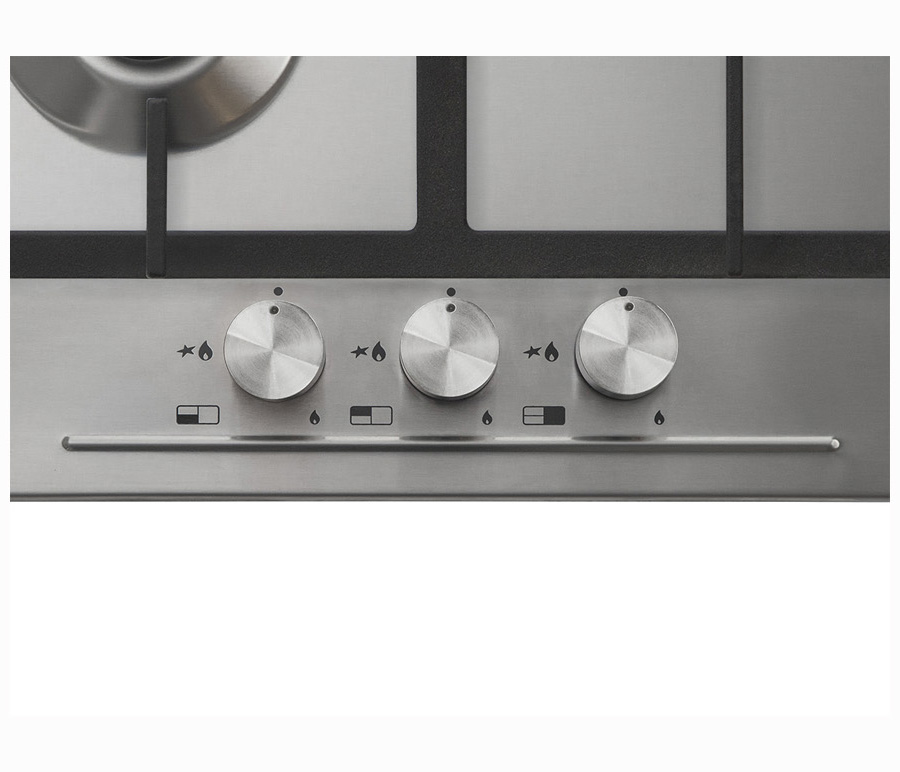 Газовая варочная панель 45см, 3 высокоэффективные конфорки, WOK- сверхмощная конфорка с тройным рядом пламени, автоматический электроподжиг, газ-контроль каждой конфорки, передние металлические переключатели, чугунные решетки, в комплекте - чугунная подставка WOK и адаптер для кофейника, цвет- нерж
