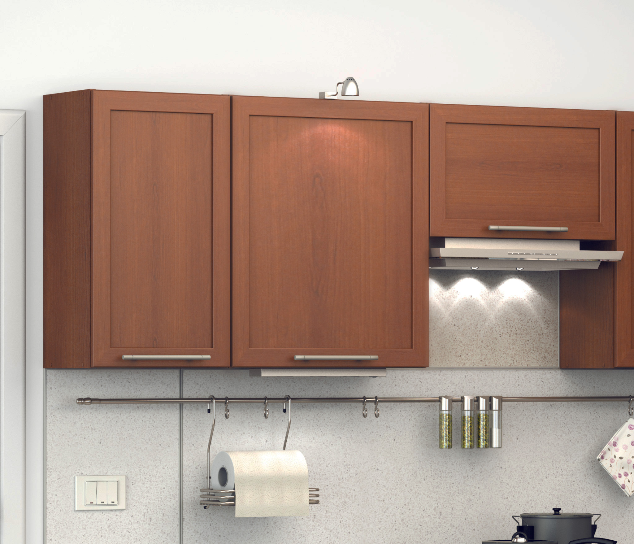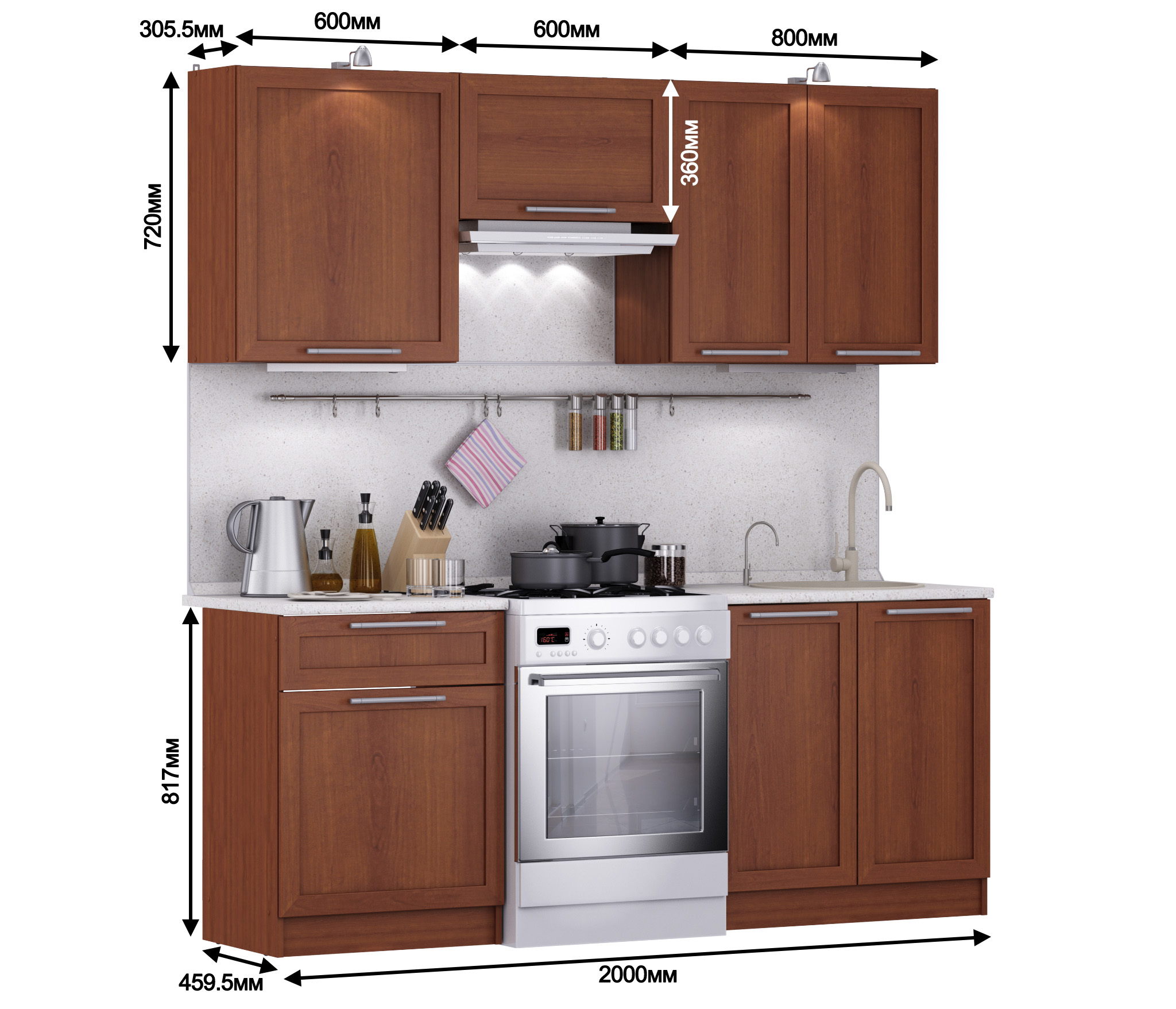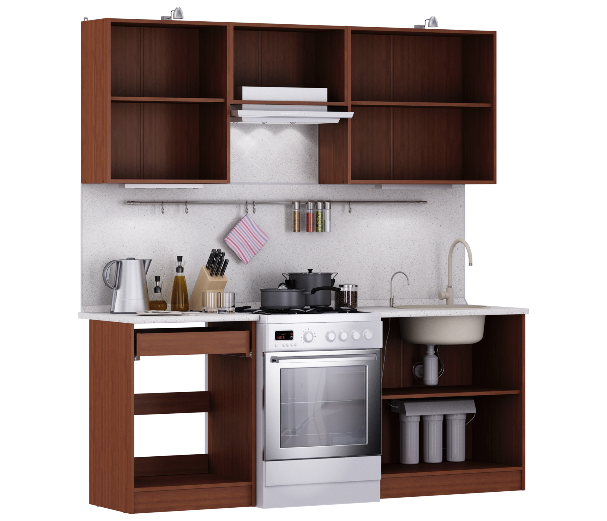 3 полки: полка 60 см, 60см полка над вытяжкой, 80 см с двумя распашными фасадами.