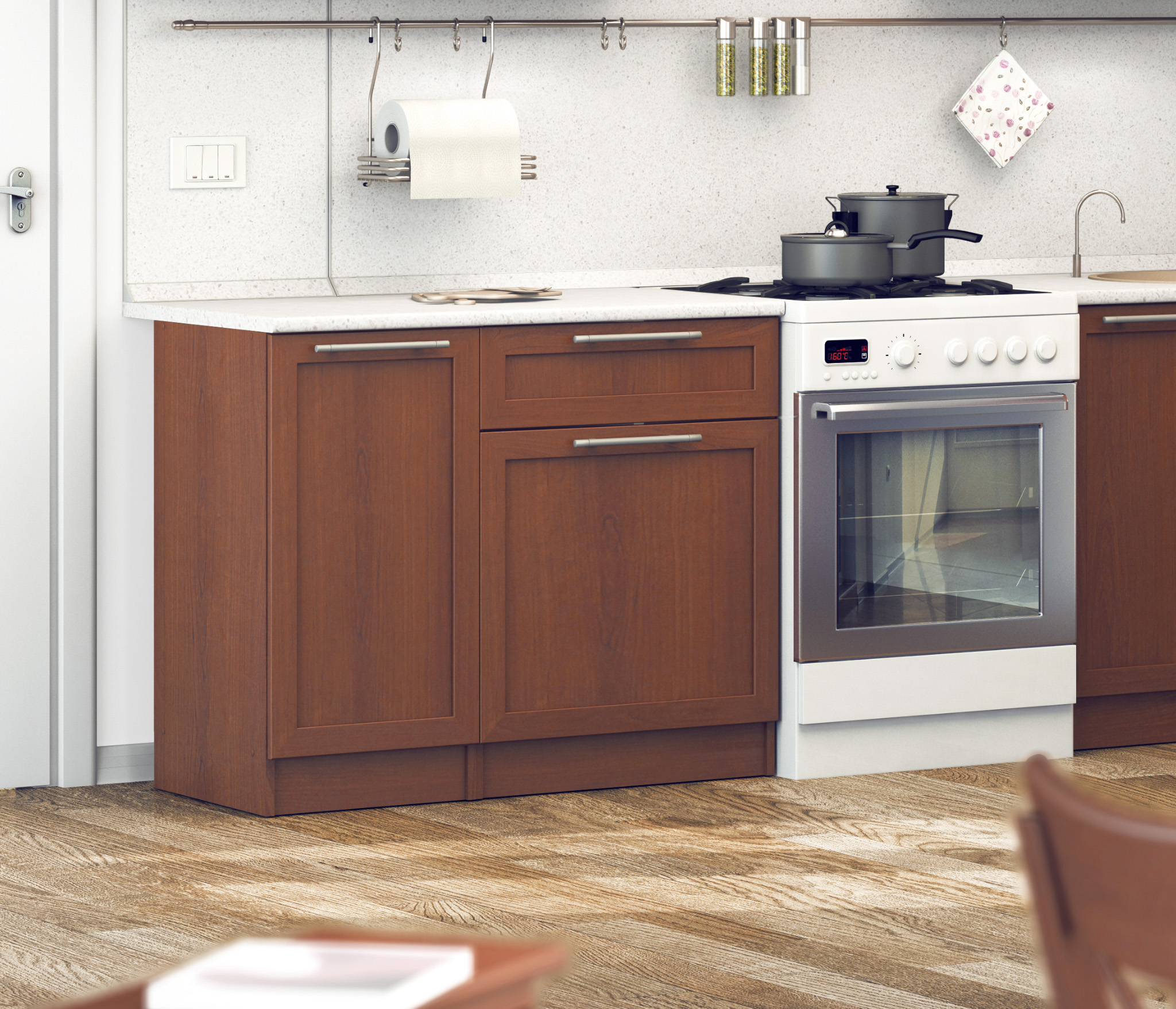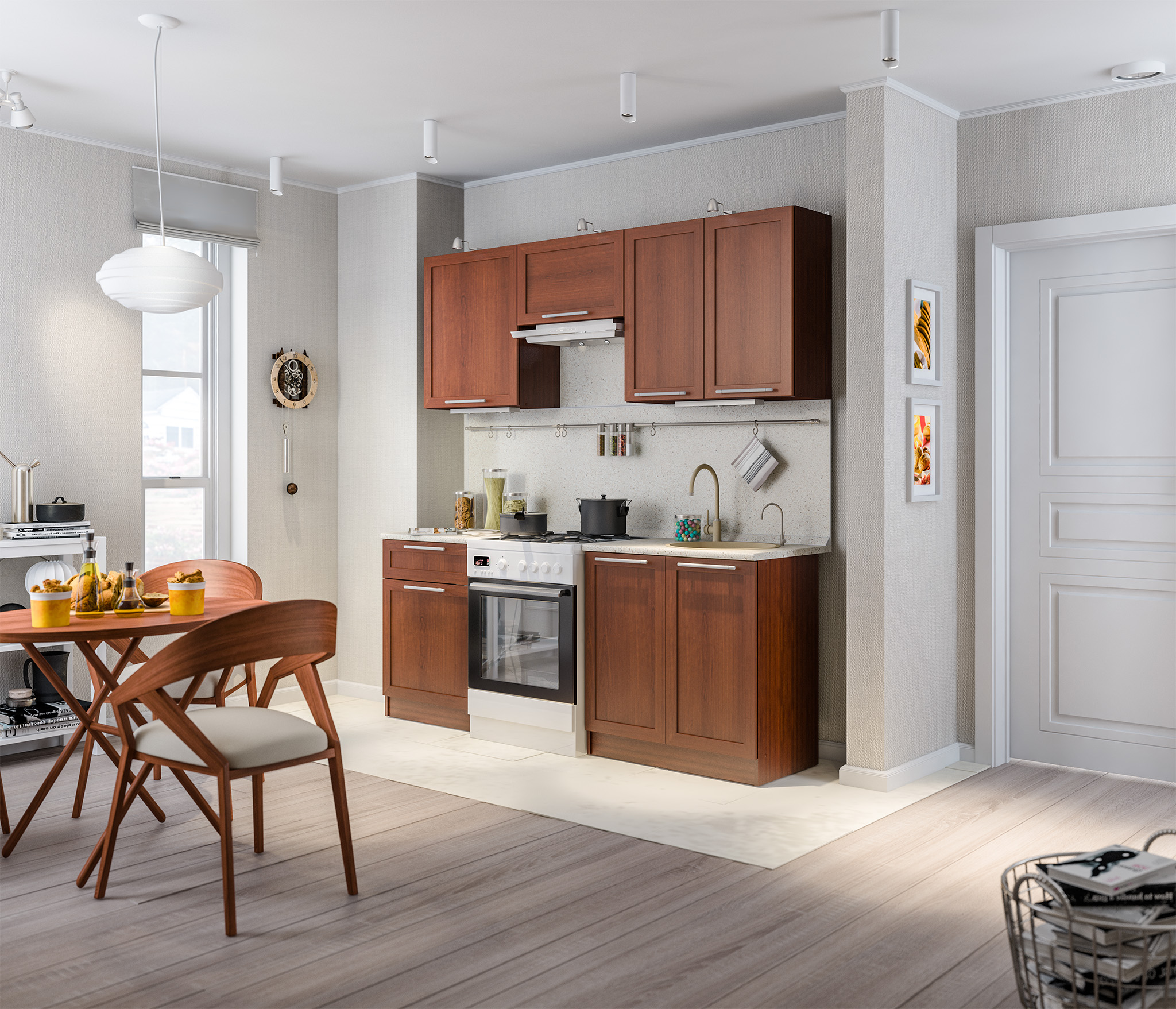 Идеально подошла кухня к другой мебели в столовой гостиной. Легко собрали.Недостаток - не доложили один шуруп нужного размера, теперь придется его подбирать в магазинах.