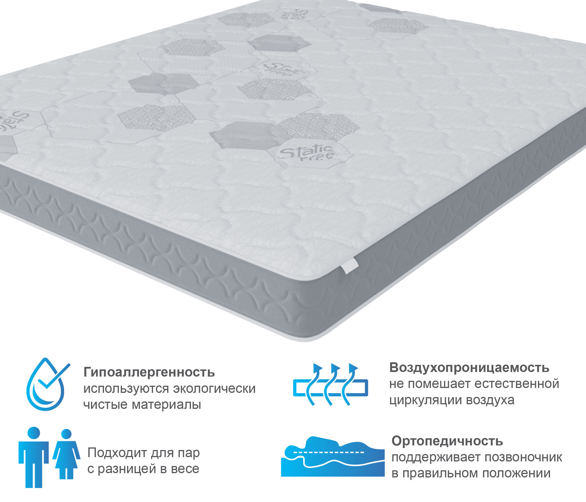 Для сохранения свойств и внешнего вида матраса, а также для разительного увеличения срока службы матраса рекомендуем использование матрас с защитным чехлом АкваСтоп. Любой матрас отвечает за правильность положения во время сна лишь нижнего и среднего отделов позвоночника, а за шейный отдел отвечает правильно подобранная ортопедическая подушка.