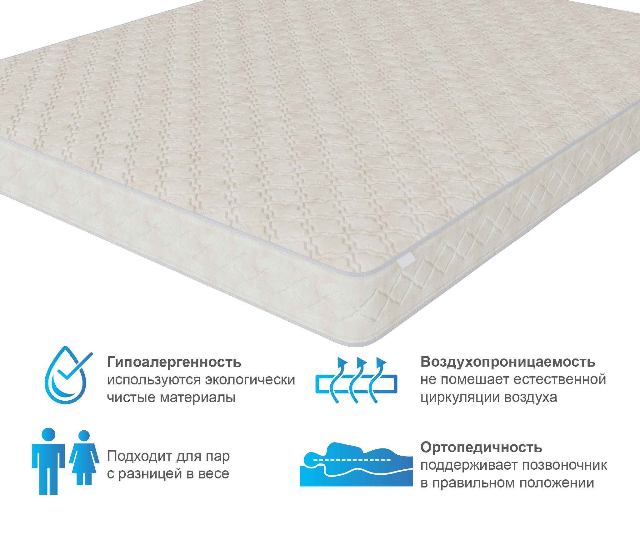Чехол из хлопкового жаккарда обеспечит надежную защиту матрасу и сохранит превосходный внешний вид на долгие годы. Материал экологически чистый, не вызывает аллергии и тем самым отлично подходит для людей склонных к аллергии. Модель рассчитана на нагрузку в 100 кг на одно спальное место.
