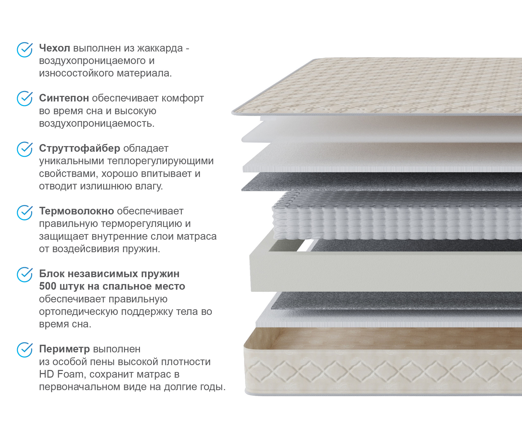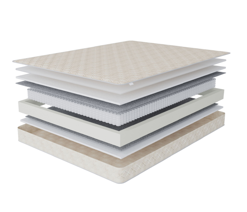 Матрас: СтруттоФайбер Лен Н20мм, блок независимый Poket spring Н140 мм, 256 пружин на 1м2, 256 пружин на 1м2, система усиления периметра матраса