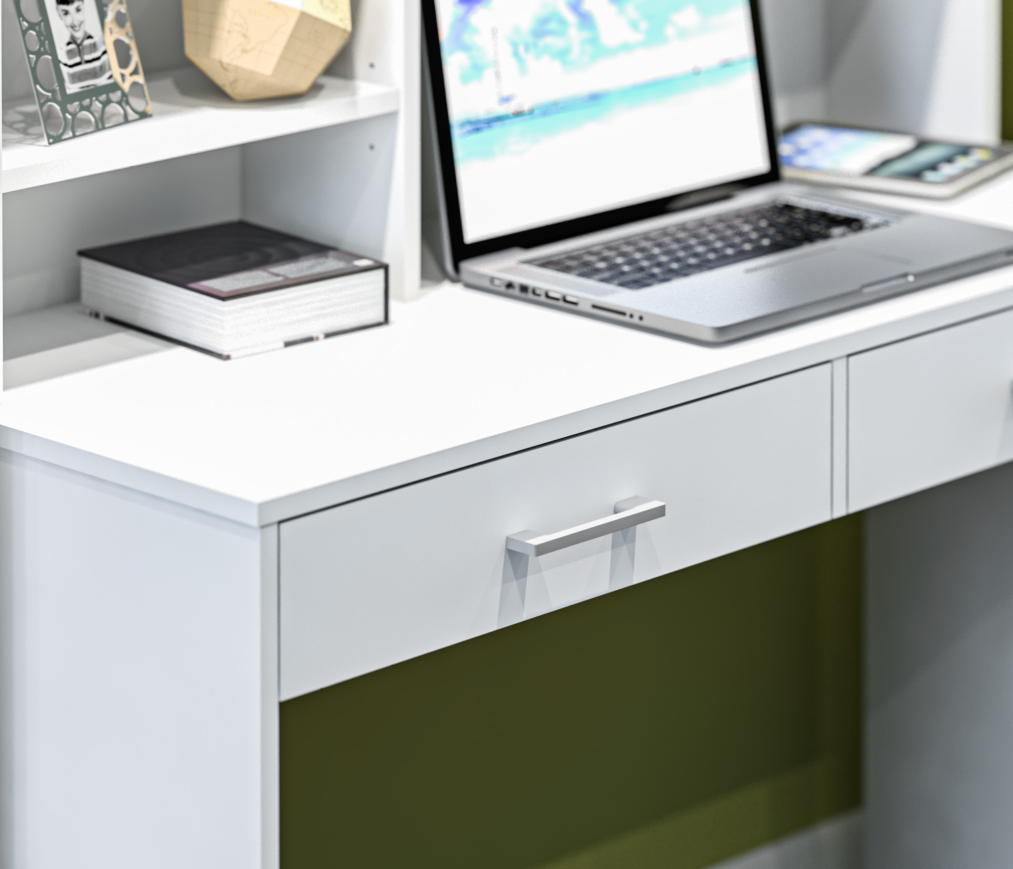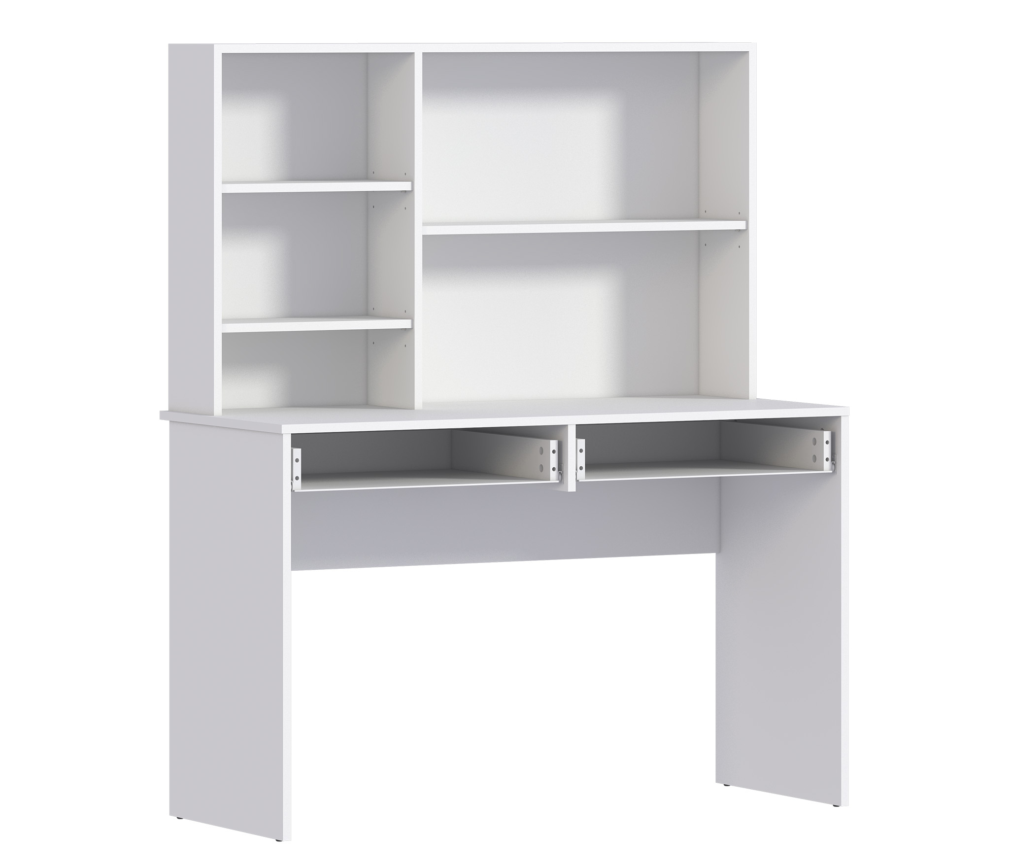 Стол Терра СБ-3213, благодаря продуманной конструкции и стильному классическому дизайну, может быть полноценным рабочим местом с возможностью размещения ноутбука и периферийной аппаратуры в детской комнате или комнате студента. Габаритные размеры – ширина 115 см, высота 143 см и глубина 50 см. Под рабочей поверхностью расположены два выдвижных ящика. Над столешницей находятся открытые вместительные полки, где можно хранить бумаги, документы, небольшой принтер и другие полезные вещи. Стол выполнен из экологичного и современного ЛДСП. Оформление отделки выполнено в белом цвете. Стильный дизайн, прочные выдвижные механизмы, качественный материал отделки дают возможность стилизовать стол Терра как самостоятельный предмет мебели, так и в составе одноименного гарнитура.