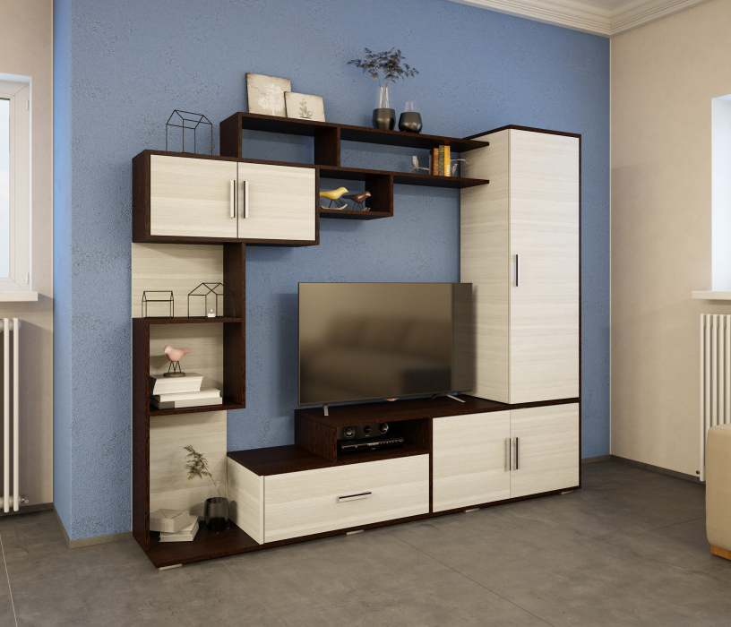 Многофункциональная гостиная ПЕКИН для общей комнаты. Благодаря контрастному сочетанию светлых и темных оттенков модель отлично впишется как современный, так и классический дизайн комнаты.