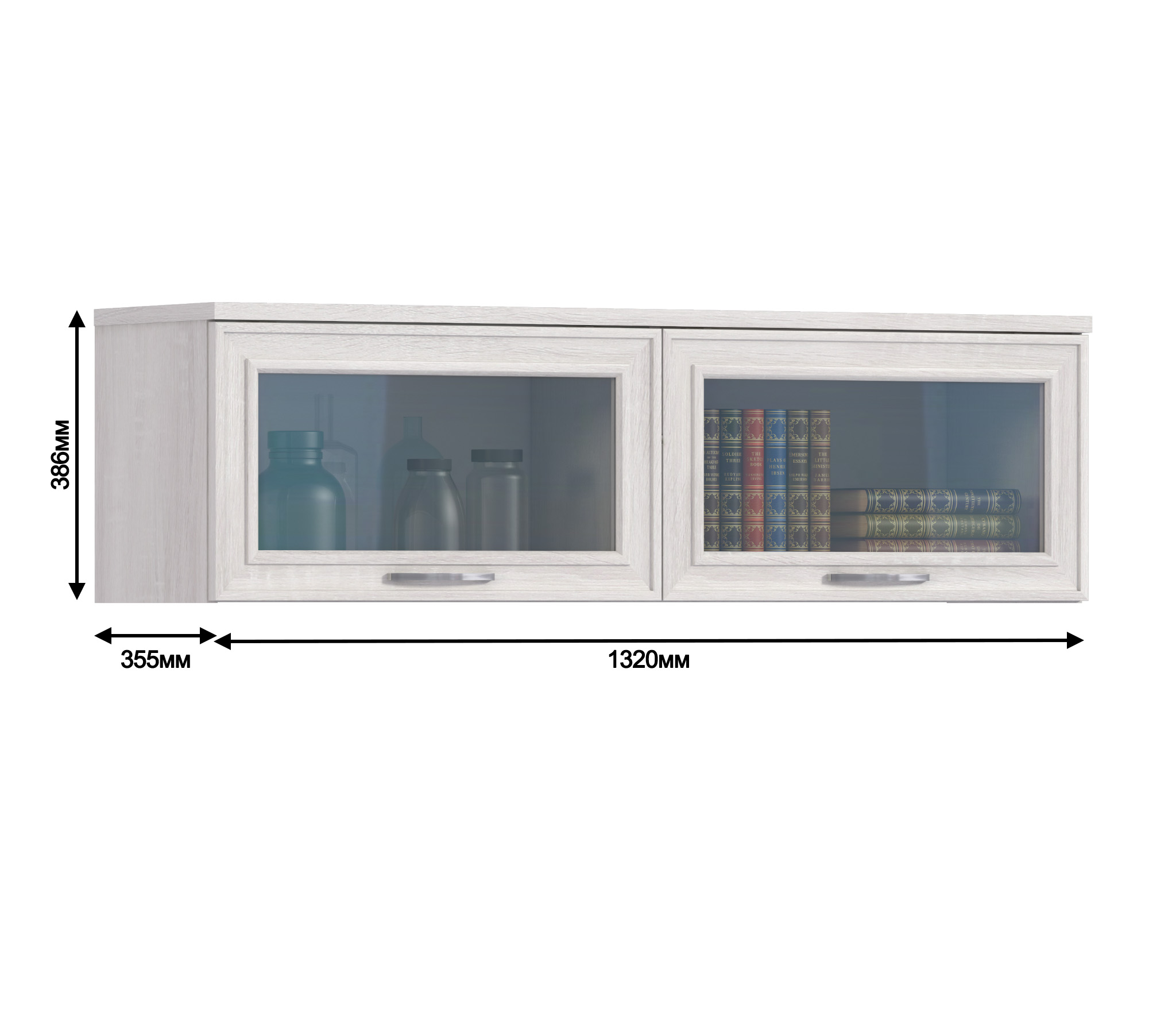 Габаритные размеры – ширина 132 см, высота 38 см и глубина 35 см. Полка имеет два вместительных отделения, каждое с остеклённой дверцей. Произведена полка из современных материалов - КДСП и МДФ.Классическое исполнение, светлый оттенок оформления «Дуб Сонома белый», подобранная фурнитура и качественные механизмы говорят о достойном качестве навесной полки Флоренция СБ-2403. Полка крепится к стене при помощи дюбелей, которые входят в комплект.