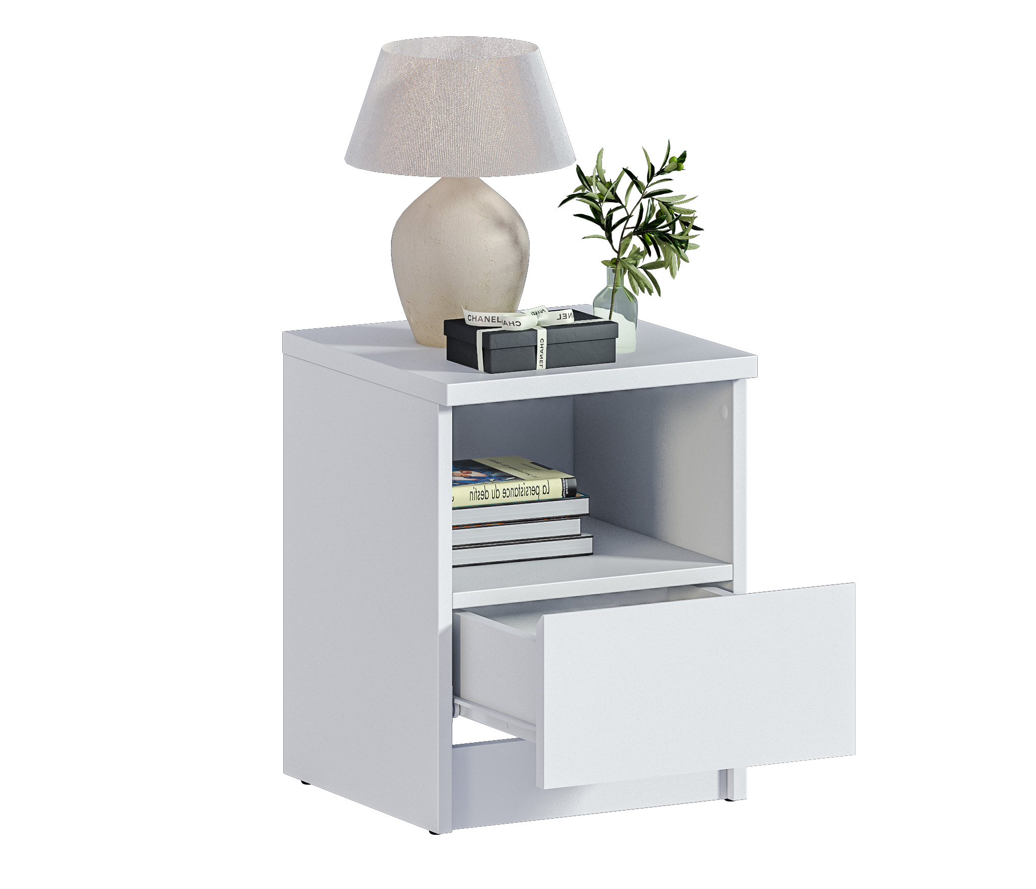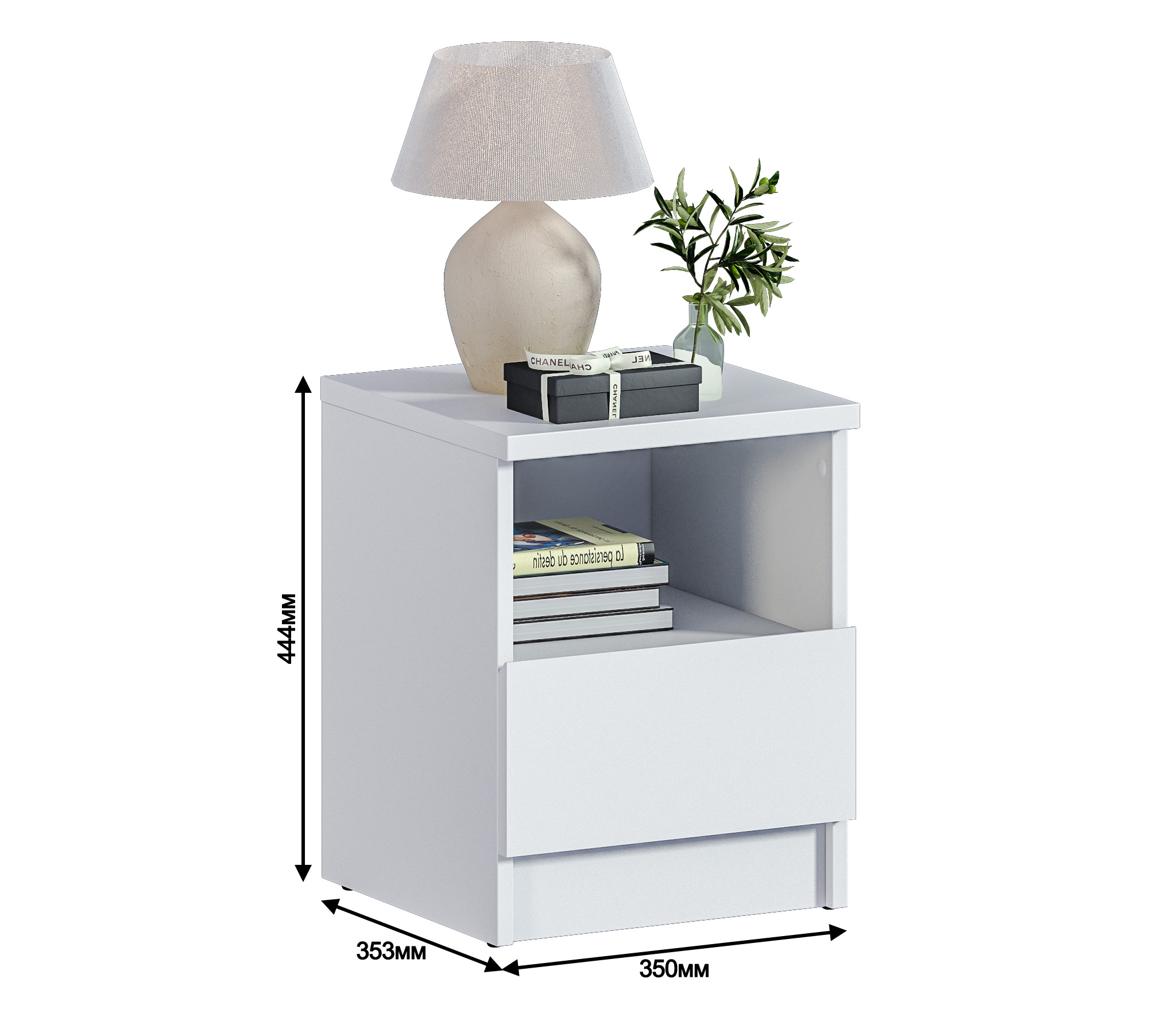 При компактных габаритных размерах – ширина 35 см, высота 44,4см и глубина 35,3 см, тумба довольно вместительная. Под столешницей расположены открытая полка и выдвижной ящик, куда можно положить планшет или книгу.