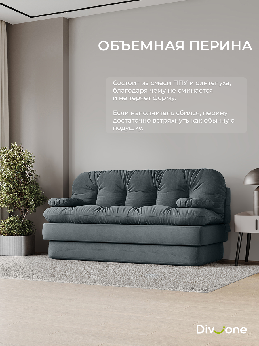 Раскладной диван легко трансформируется из удобного места для отдыха в большое полноценное спальное место. Для раскладывания необходимо просто отодвинуть его от стены и опустить спинку. Его можно использовать в качестве кровати для одного взрослого человека или как двуспальный диван еврокнижка. Перина и декоративные подушки помогут организовать дополнительное спальное место. Это особенно удобно, если у вас часто остаются гости на ночь.