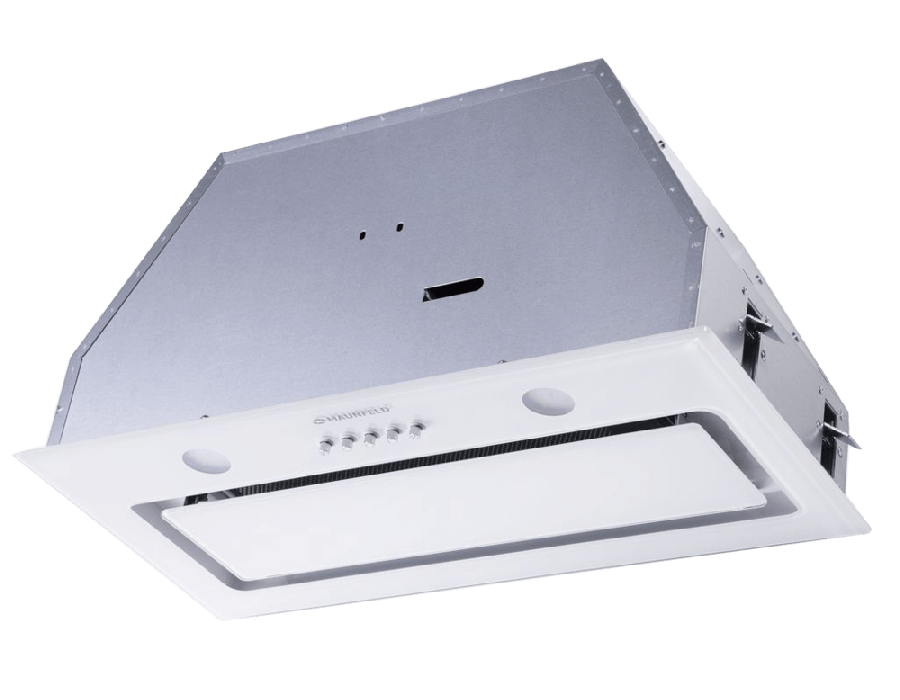 Фронтальная панель выполнена из глянцевого закаленного стекла белого цвета. За откидной панелью находится многослойный жироулавливающий фильтр, который легко вынимается и полностью разбирается, что сильно упрощает чистку. Загрязненный воздух втягивается по всему периметру панели.