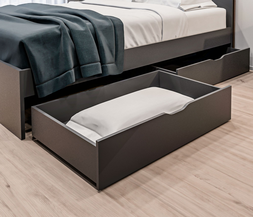 Ящик легко выдвигается и скрывается под кроватью, не занимая лишнего места. Он представляет собой удобное решение для хранения, позволяющее максимально использовать пространство в спальне.