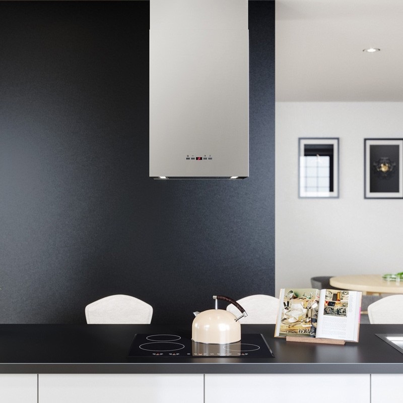 • Дизайнерская островная вытяжка в форме прямоугольного параллелепипеда становится центральным вертикальным элементом, связывающим дизайн кухни воедино. Стильное сочетание нержавеющей стали «сатин» и блеска закаленного стекла создают ощущение легкости прочной конструкции. Декоративный стеклянный люк скрывает алюминиевый, жироулавливающий фильтр, придавая завершенность композиции